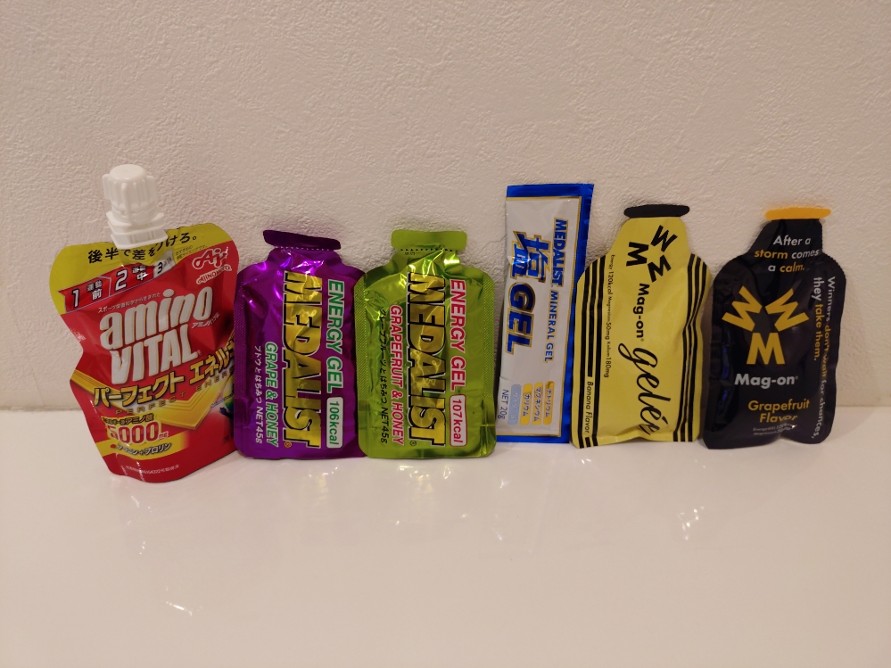 今回の補給ジェルは「アミノバイタル」「MEDALIST」「Mag-on」と、実績のある製品で揃えました。給水所のタイミングに合わせて摂取し、胃腸への負担を最小限にしながらエネルギーを切らさないことを意識しています。